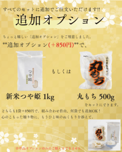 新米つや姫1kg🌾・丸もち500gを、どのセットにも追加できます。